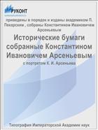 Исторические бумаги собранные Константином Ивановичем Арсеньевым : с портретом К. И. Арсеньева / приведены в порядок и изданы академиком П. Пекарским , собраны Константином Ивановичем Арсеньевым .— : Типография Императорской Академии наук, 1872 .— 512 с. — URL: https://rucont.ru/efd/101570 (дата обращения: 08.11.2025)