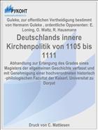 Guleke, H. Deutschlands innere Kirchenpolitik von 1105 bis 1111 : Abhandlung zur Erlangung des Grades eines Magisters der allgemeinen Geschichte verfasst und mit Genehmigung einer hochverordneten historisch-philologischen Facultat der Kaiserl. Universitat zu Dorpat / zur offentlichen Vertheidigung bestimmt von Hermann Guleke , ordentliche Opponenten: E. Loning, O. Waltz, R. Hausmann; H. Guleke .— : Druck von C. Mattiesen, 1882 .— 121 с. — Lang: ger .— URL: https://rucont.ru/efd/132234 (дата обращения: 15.11.2025)