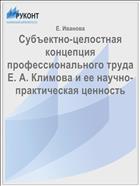 КЛИМОВА И ЕЕ НАУЧНО-ПРАКТИЧЕСКАЯ ЦЕННОСТЬ В статье представлена субъектно-деятельностная концепция профессионального труда Е.А. Климова, рассматриваемая как теоретико-методическая основа, обеспечивающая построение научной стратегии решения целого ряда прикладных задач, направленных на обеспечение взаимосоответствия человека и профессии. <...> Ключевые слова: эргатическая система, субъект труда, психологические признаки субъекта труда, психические регуляторы труда, конфликтующие реальности. <...> Предпосылками развития субъектно-деятельностного подхода в отечественной психологии были работы целого ряда ученых — Л.С. Выготского, В.Н. Мясищева, С.Л. Рубинштейна, А.Н. Леонтьева, Б.Г. Анань ева и др. <...> В этих работах рассматривались онтология и онтогенез развития человека как субъекта, изучались различные качества, определялись механизмы развития и формирования человека как субъекта деятельности. <...> Е.А. Климов начинает развивать концепцию субъектнодеятельностного подхода в рамках задач профессионального самоопределения и профконсультирования. <...> Эта концепция раскрылась сначала в многопризнаковой психологической классификации профессий, в основе которой лежит осознаваемое отношение человека к окружающей его действительности, его интересы, склонности и возможности (Климов, 1984). <...> Иванова Елена Михайловна — докт. психол. наук, доцент кафедры психологии труда и инженерной психологии ф-та психологии МГУ. <...> E-mail: ivanova@mail.ru 15 В настоящее время субъектно-деятельностную концепцию профессионального труда Е.А. Климова можно рассматривать как теоретикометодическую основу, обеспечивающую построение научной стратегии решения целого ряда прикладных задач в сфере профессионального труда и его организации. <...> Эта концепция направляет взгляд исследователя в первую очередь на духовный мир человека: его интересы, ценности, мировоззрение, смыслы; познавательную активность; стремление к осознанию и пониманию отношений <...>