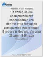 Федоров, Б.М. На совершение священнейшего коронования его величества государя императора Александра Второго в Москве, августа 26 дня, 1856 года : [Стихотворение] / [Борис Федоров]; Б.М. Федоров .— : тип. Александра Семена, 1856 .— 15 с. — URL: https://rucont.ru/efd/51783 (дата обращения: 11.11.2025)