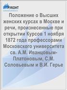 Положение о Высших женских курсах в Москве и речи, произнесенные при открытии Курсов 1 ноября 1872 года профессорами Московского университета св. А.М. Иванцовым-Платоновым, С.М. Соловьевым и В.И. Герье .— : [Б.и.], 1872 .— 35 с. — URL: https://rucont.ru/efd/58311 (дата обращения: 11.11.2025)