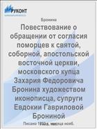 Бронина, Е.Г. Повествование о обращении от согласия поморцев к святой, соборной, апостольской восточной церкви, московского купца Захария Федоровича Бронина художеством иконописца, супруги Евдокии Гавриловой Брониной : Писано 1833 г. месяца нояб. / Е.Г. Бронина .— : Унив. тип., 1843 .— 73 с. — URL: https://rucont.ru/efd/64628 (дата обращения: 15.11.2025)