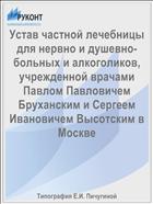 Устав частной лечебницы для нервно и душевно-больных и алкоголиков, учрежденной врачами Павлом Павловичем Бруханским и Сергеем Ивановичем Высотским в Москве .— : Типография Е.И. Пичугиной, 1910 .— 7 с. — URL: https://rucont.ru/efd/80891 (дата обращения: 10.11.2025)